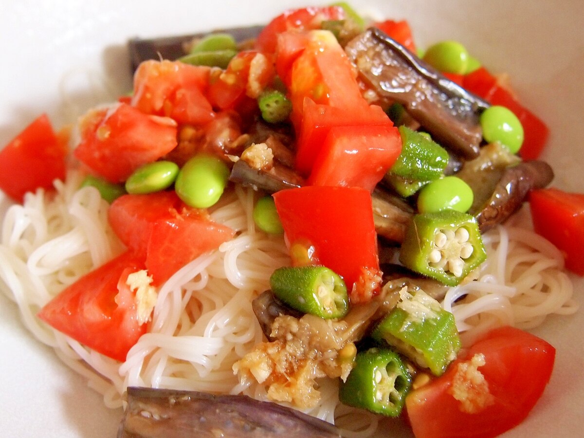 なすとオクラとトマトのぶっかけそうめん レシピ 作り方 By まるっとまる 楽天レシピ