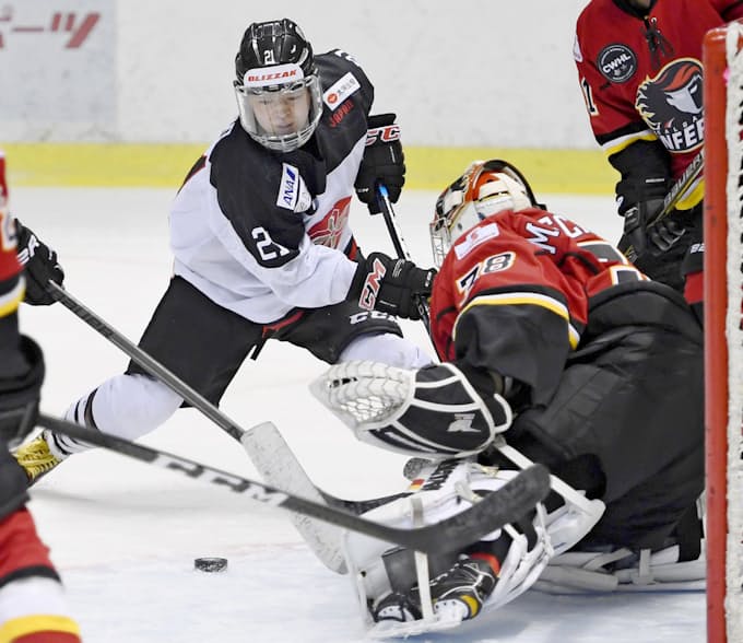 アイスホッケー 日本4戦全敗 女子5カ国対抗戦 スウェーデン戦でプレーする大沢 左 ラウマ 共同 四国新聞社