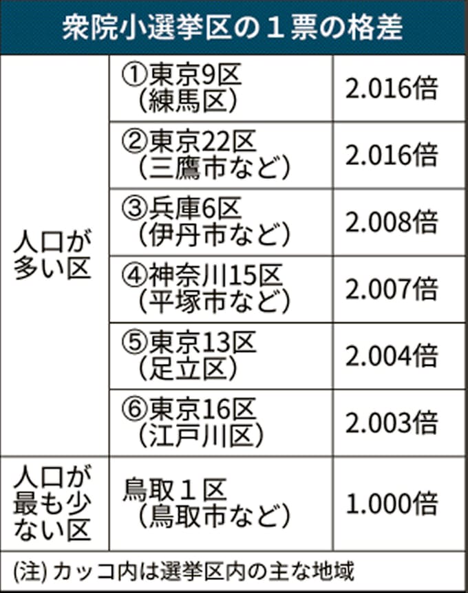 1票の格差 衆院で最大2 016倍 2倍超は6選挙区 日本経済新聞