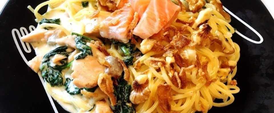 サーモンとほうれん草のクリームパスタ くるみ フライドオニオンを添えて 野山 苺摘 フードライター Note
