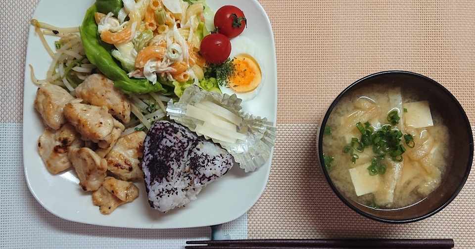 夕ご飯は鶏の唐揚げ風ふっくら焼き もやしと豆苗の炒め物 マカロニサラダ 大根のぬか漬け もち麦ユカリおにぎり 油揚げ と豆腐のお味噌汁 ๑ ๑ モグモグ ウズ Note